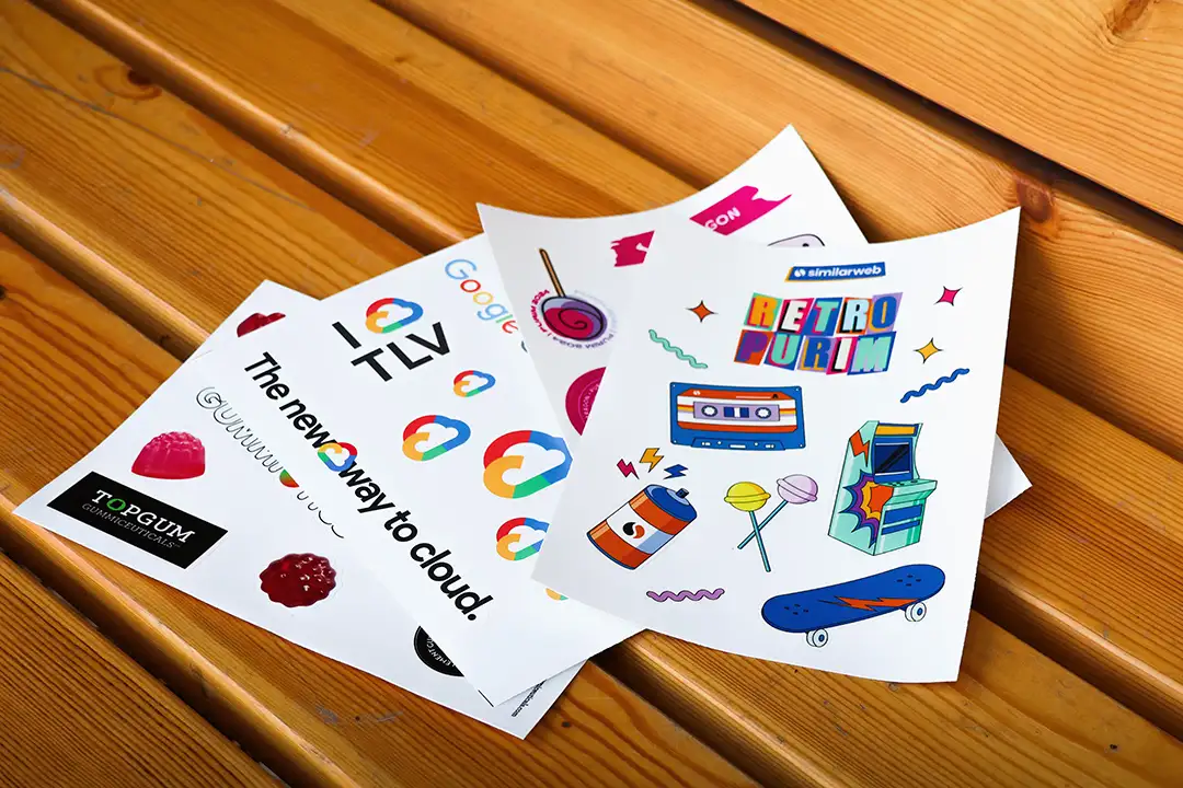 צרו דף סטיקרים ייחודי לכם. תמונות, עיצובים, אמנות שלכם - דמיינו את היצירות שלכם מופצות לעולם בעזרת דף סטיקרים נגיש לכל יד. פריסת העיצוב לפי רצונכם, על גבי גיליונות בגדלים שונים. הסטיקרים שלנו עשויים מויניל איכותי בעלי ציפוי למינציה מט UV, ובכך עמידים לכל תנאי החוץ. שלחו לנו את הקובץ, גודל וכמות, ומכאן אנו נדאג להגשים לכם דף מדבקות מיוחד משלכם.